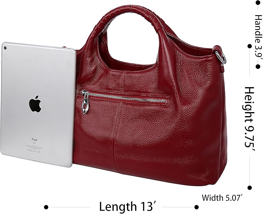 • Spacious, smartly divided inside, the leather handbags have 2 main compartments, 1 zipped pocket divider, 2 slots pockets and 1 zipper pocket for cell phone, credit cards, keep you stuffs organized. Easily fit your IPAD, umbrella, wallet and makeups.