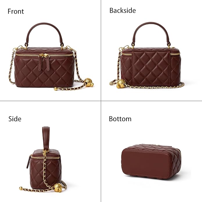 - Structure: Vintage Quilted Design With Square Box Shape. Two Zipper Closure Opening. Interior Including Three Credit Card Slots And One Earphone ( Lipstick) Holder. Come With One Adjustable And Detachable Metal Ball Chain Strap